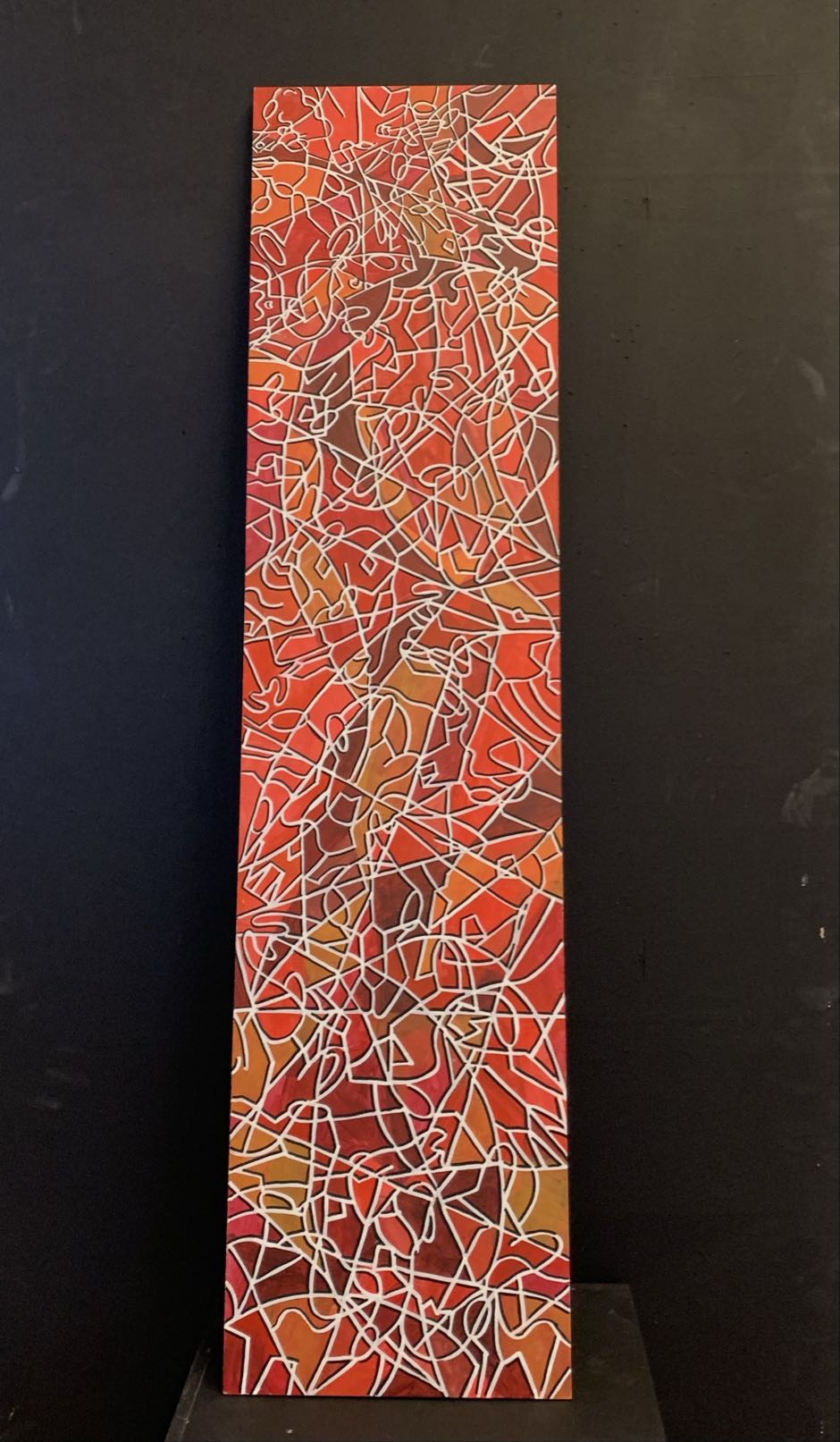 Ik besloot me voor dit werk te laten inspireren door de apocalyptische werken van Kandinsky. Ik ontwierp vier schedels en ging deze overlappend op elkaar projecteren. Ik creëerde vlakken door de toevoeging van extra gebogen en rechte lijnen. Deze vlakken kregen elk een verschillende roodtint (licht-donker). Hier bovenop tekende ik opnieuw een overlappende compositie van de schedels en die heb ik uiteindelijk met acrylstiften omlijnd. Bekijk hier mijn werkproces!