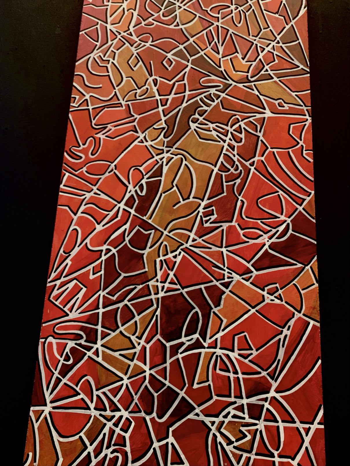 I decided to take inspiration for this work from Kandinsky's apocalyptic works. I designed four skulls and started projecting them overlapping on top of each other. I created planes by adding additional curved and straight lines. These planes were each given a different shade of red (light-dark). On top of this, I again drew an overlapping composition of the skulls, which I finally outlined with acrylic markers. Check my work process here!