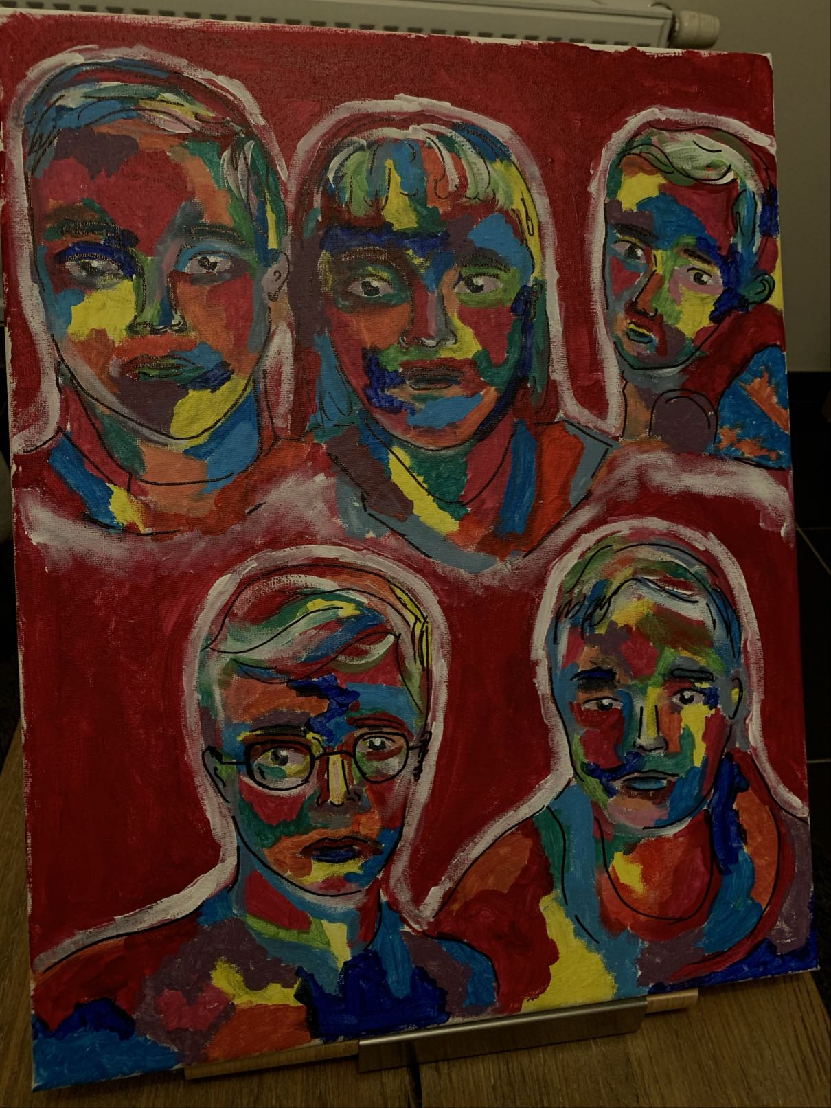 Ik maakte dit werk in mijn vrije tijd. Het stelt een portret voor van mijn gezin. Ik begon met het tekenen van alle portretten. Hierna schilderde ik ze allemaal met een vlekkerige penseeltoets en een rijk palet aan kleuren. Ik werkte het af door de figuren te omlijnen met zwarte contourlijnen. Bekijk hier mijn werkproces!
