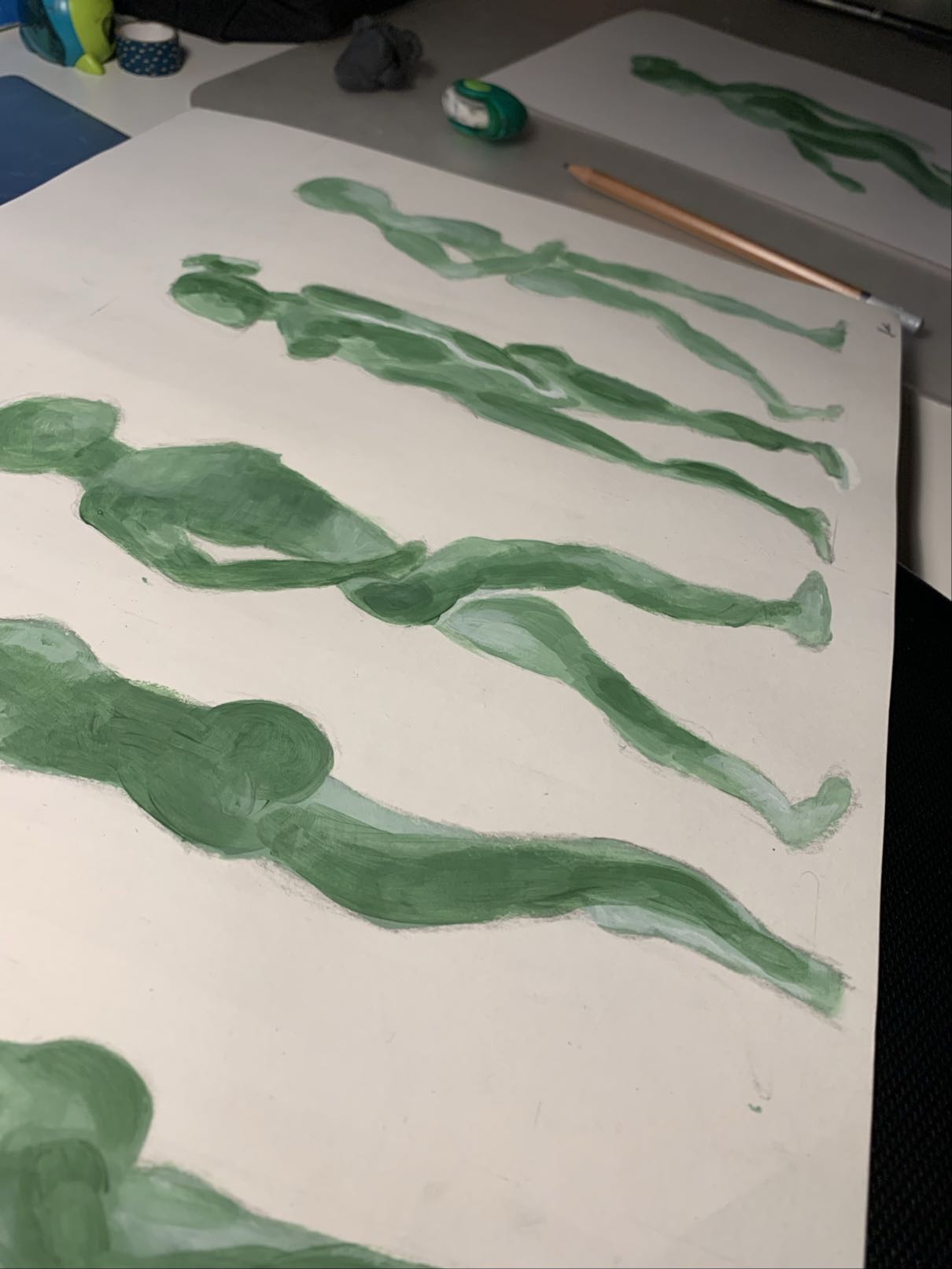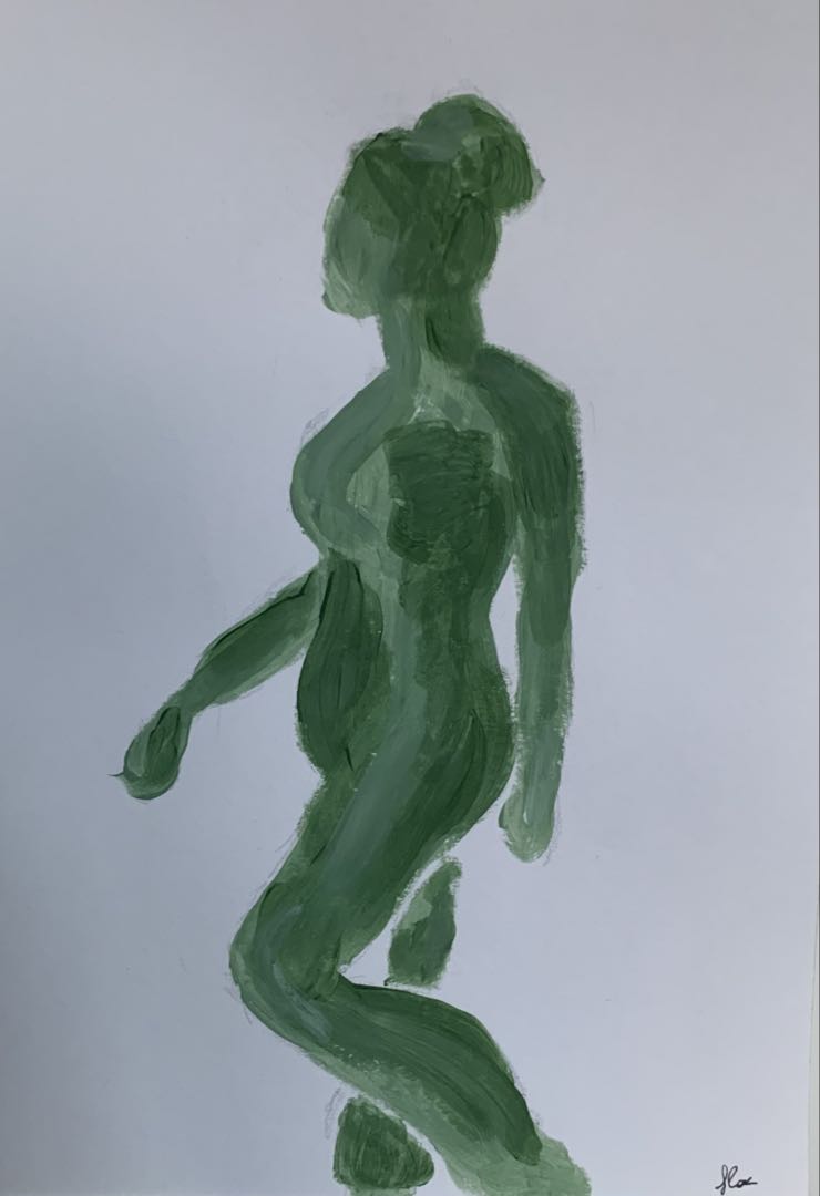 I started by sketching the figure in pencil. After this, I worked out the figure with acrylic paint. I chose different shades of green.